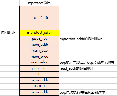 可以把 0x080ea000 到 0x080ec000 都修改成可以执行的。因此得到mprotect的参数(0x080ea000,0x2000,0x7)。同样为了使程序继续执行我们构造好的系统调用,需要把压入的参数压出,因此我们在 read 返回地址处填入一个可以pop 3个的地址