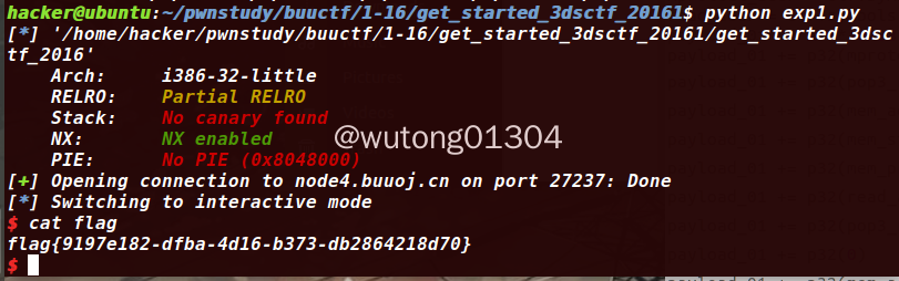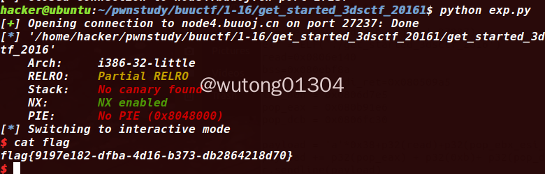 具体来说,通过溢出使其转到get_flag函数,然后使get_flag的参数等于814536271和425138641的地址就可以了(直接在IDA里面就可以找到)。注意程序需要正常退出才能回显,所以要使flag的返回地址后加一个退出地址。