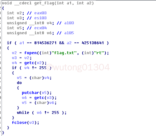 细心观察可以发现,有一个get_flag函数,令 if ( a1 == 814536271 && a2 == 425138641 )满足,可以直接获得flag: