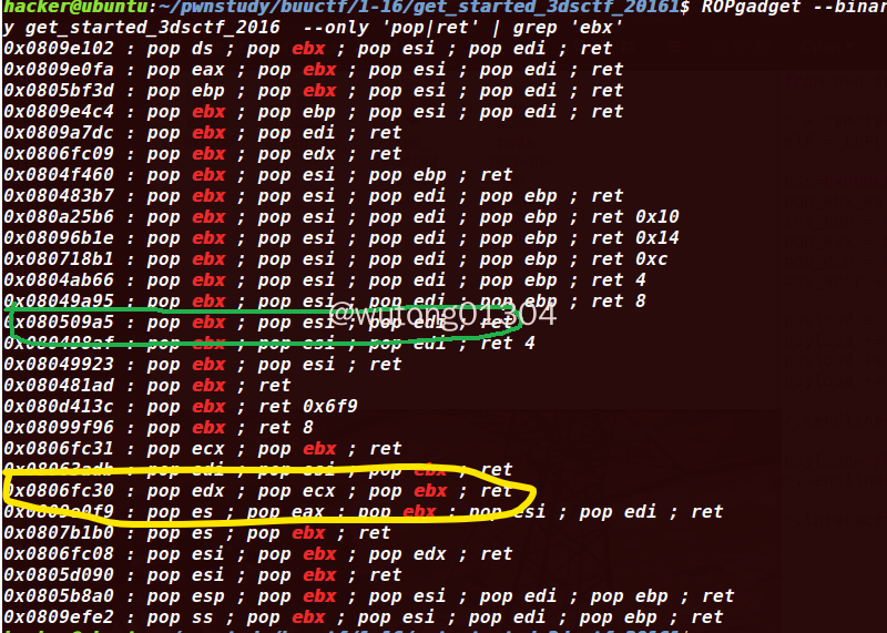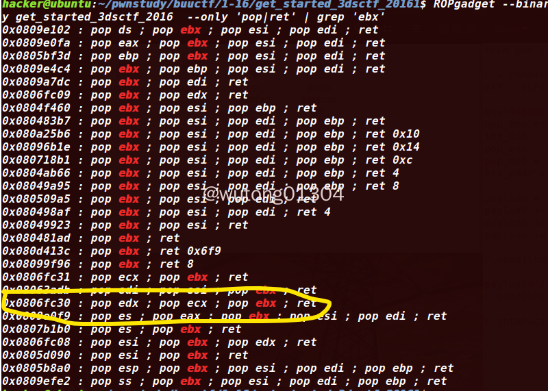 1 | ROPgadget --binary get_started_3dsctf_2016 --only 'pop|ret' | grep 'eax' |