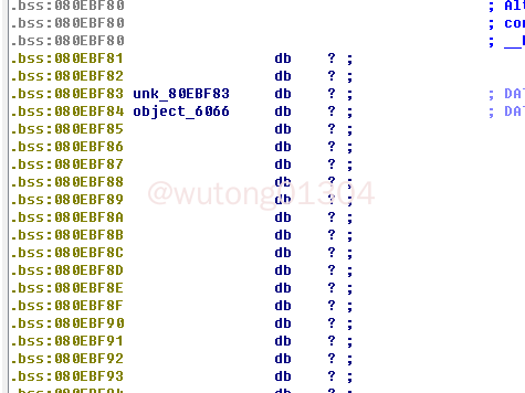 在IDA里面寻找一段没有数据的bss段地址,在这里,选取的是 0x0x080ebf8A: