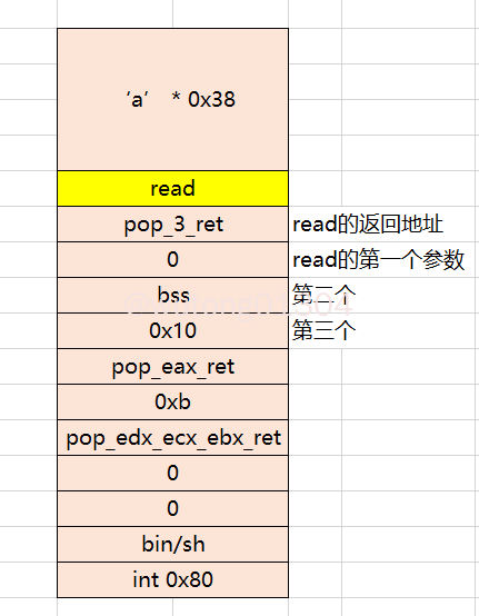 然后需要构造read函数的参数。构造read函数如下:read(0,bss,0x10),即向bss地址处写入0x10字节的内容。