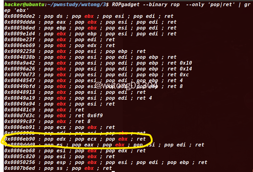 1 | ROPgadget --binary rop --only 'pop|ret' | grep 'ebx' |