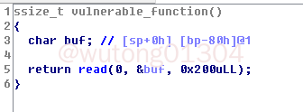 在vulnerable函数中,read函数读取字节超出0x80(可以直接看上面 buf 的位置,bp-80h,就表示距离ebp 0x80个字节,即栈大小0x80),存在溢出漏洞。