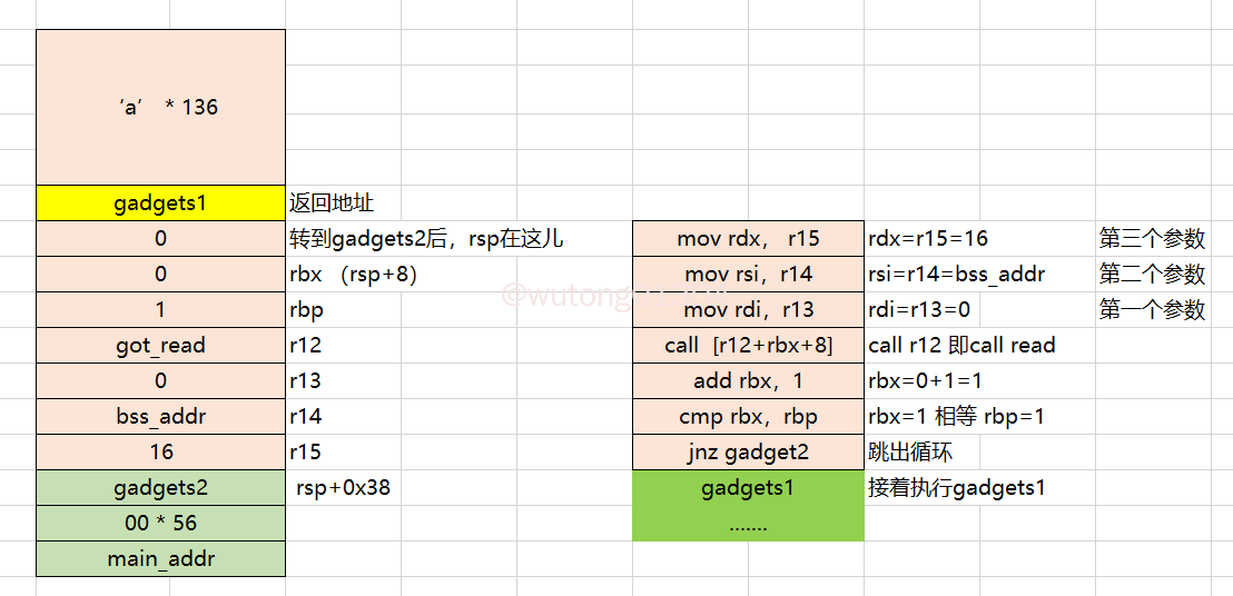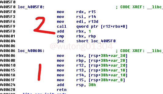 我们将这两段 gadgets 分别记为 gadgets1(loc_400606) 和gadgets2 (loc_4005F0)。即下面的一段指令为第一段,上面的为第二段。两段的作用如下: