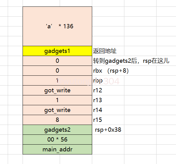 第一段gadgets的作用是,将栈中的数据依次移入到rbx、rbp、r12、r13 、r14、r15寄存器,然后将 rsp 寄存器往下移动 0x38 字节。因此正常情况下,汇编指令的作用如下: