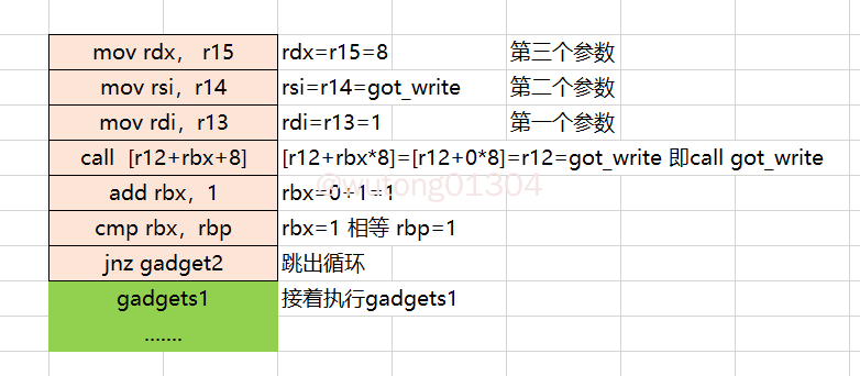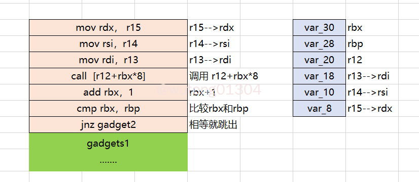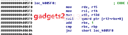 第二段gadgets的作用是,将 r15 寄存器的内容移到 rbx 寄存器;将r14寄存器的内容移到 rsi 寄存器,将 r13 寄存器的内容移到 edi (rdi)寄存器,然后调用r12+rbx+8 地址处的东西,调用完毕后,将 rbx 加1,然后比较 rbx 和 rbp 的值,若不相等,就跳转到gadget2,即循环执行gadgets2。如果相等就跳出去执行下面的gadget1了。