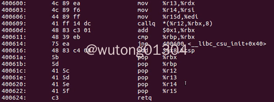 显然,没有可以利用的。此时应该怎么办呢?我们可以利用 x64 下的 __libc_csu_init 中的 gadgets。这个函数是用来对 libc 进行初始化操作的,而一般的程序都会调用 libc 函数,所以这个函数一定会存在。我们先来看一下这个函数(当然,不同版本的这个函数有一定的区别)。