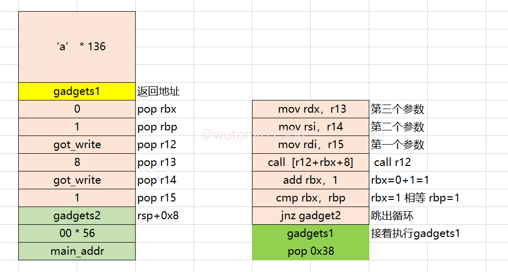 也就是说,如果我们先执行第一段gadgets1,再执行第二段gadgets2,那么我们知识可以控制 6个寄存器后,再让它调用函数,这样一来,只要安排合理,我们可以利用这两段 gadgets 执行许多命令。