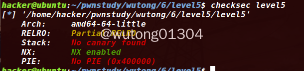 按照常规思路,没有找到后门和system函数,且栈不可执行(使用checksec命令可以看文件保护信息,如下图),考虑ret2libc,通过已有函数泄露libc地址。