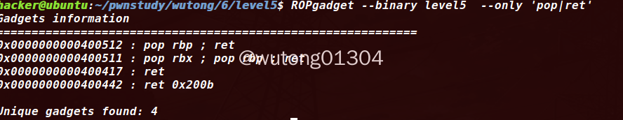 由于是64位文件,我们在溢出时需要pop rdi,ret 的gadget来改变寄存器,使用ROPgadget工具进行寻找: