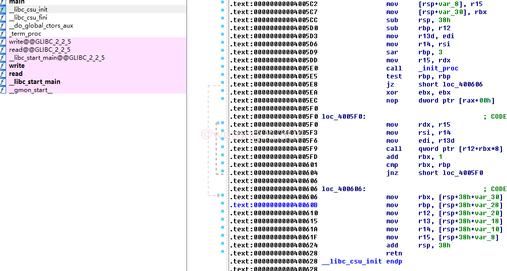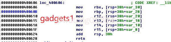 可以看到在 loc_4005F0 和 loc_400606的位置有一长串操作寄存器的指令,这就是我们要利用的gadgets了。