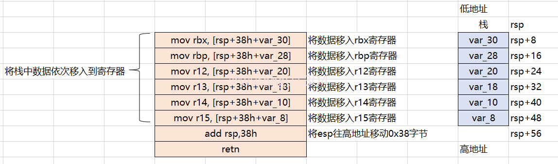 rsp 原本在栈顶,在将栈中的数据处理完毕后,会将 rsp 寄存器往下移动56个字节,相当于清楚栈空间,这符合我们对栈操作的理解。值得注意的是,为什么[rsp+38h+var_30] 指的是rsp+8的位置呢?其实观察反汇编发现,var_30 的汇编为 -30h,也就是rsp+38h-30h,也就是rsp+8的地方了。