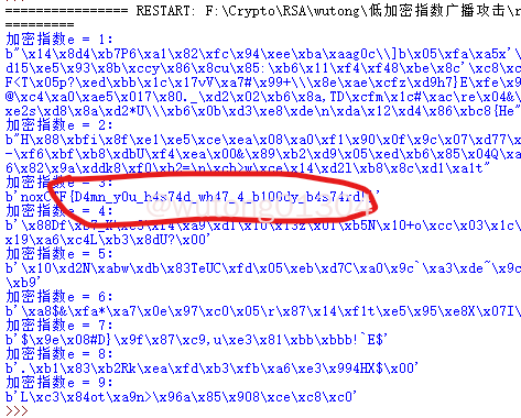 if __name__ == "__main__": #========== n c ========== n1 = "331310324212000030020214312244232222400142410423413104441140203003243002104333214202031202212403400220031202142322434104143104244241214204444443323000244130122022422310201104411044030113302323014101331214303223312402430402404413033243132101010422240133122211400434023222214231402403403200012221023341333340042343122302113410210110221233241303024431330001303404020104442443120130000334110042432010203401440404010003442001223042211442001413004" c1 = "310020004234033304244200421414413320341301002123030311202340222410301423440312412440240244110200112141140201224032402232131204213012303204422003300004011434102141321223311243242010014140422411342304322201241112402132203101131221223004022003120002110230023341143201404311340311134230140231412201333333142402423134333211302102413111111424430032440123340034044314223400401224111323000242234420441240411021023100222003123214343030122032301042243" n2 = "302240000040421410144422133334143140011011044322223144412002220243001141141114123223331331304421113021231204322233120121444434210041232214144413244434424302311222143224402302432102242132244032010020113224011121043232143221203424243134044314022212024343100042342002432331144300214212414033414120004344211330224020301223033334324244031204240122301242232011303211220044222411134403012132420311110302442344021122101224411230002203344140143044114" c2 = "112200203404013430330214124004404423210041321043000303233141423344144222343401042200334033203124030011440014210112103234440312134032123400444344144233020130110134042102220302002413321102022414130443041144240310121020100310104334204234412411424420321211112232031121330310333414423433343322024400121200333330432223421433344122023012440013041401423202210124024431040013414313121123433424113113414422043330422002314144111134142044333404112240344" n3 = "332200324410041111434222123043121331442103233332422341041340412034230003314420311333101344231212130200312041044324431141033004333110021013020140020011222012300020041342040004002220210223122111314112124333211132230332124022423141214031303144444134403024420111423244424030030003340213032121303213343020401304243330001314023030121034113334404440421242240113103203013341231330004332040302440011324004130324034323430143102401440130242321424020323" c3 = "10013444120141130322433204124002242224332334011124210012440241402342100410331131441303242011002101323040403311120421304422222200324402244243322422444414043342130111111330022213203030324422101133032212042042243101434342203204121042113212104212423330331134311311114143200011240002111312122234340003403312040401043021433112031334324322123304112340014030132021432101130211241134422413442312013042141212003102211300321404043012124332013240431242" cList = [int(c1,5), int(c2,5), int(c3,5)] nList = [int(n1,5), int(n2,5), int(n3,5)] m_e = CRT(cList, nList) #计算m^e #print(m_e) for e inrange(1, 10): #遍历e求解 m, f = gmpy2.iroot(m_e, e) #m_e开e次根 print("加密指数e = %d:"%e) m = hex(m)[2:] iflen(m)%2 == 1: m = m + '0'#binascii.unhexlify()参数长度必须为偶数,因此做一下处理 flag = binascii.unhexlify(m) print(flag)
