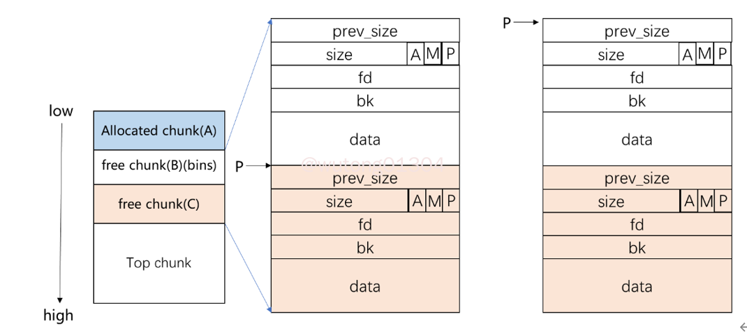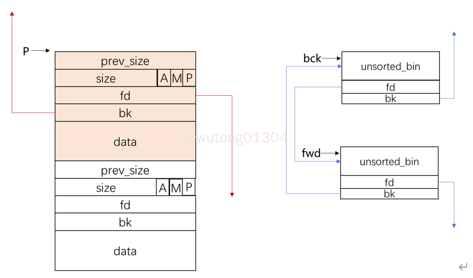 3、检查前驱节点的 bk 指针和后继节点的 fd 指针是否正确指向当前内存块 P。如果不正确,表示双向链表的链接关系出现了错误。
