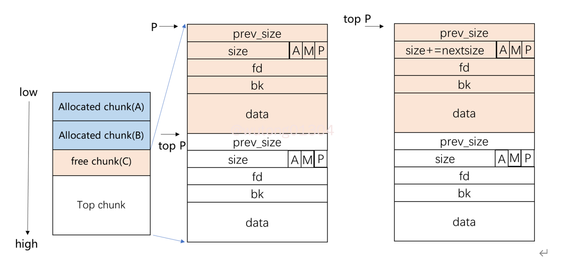 合并高地址处相邻的chunk。如果向前相邻 top_chunk****,则直接合并到 top_chunk****。