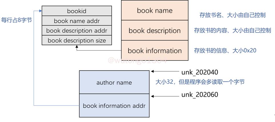 在创建书时,系统会申请3个堆,分别存放book name、book description、v3。其中前两个堆大小需要输入,v3大小为0x20。v3里面会存放book description的大小、指针book name的指针和书的id,而v3(指针地址)则会存入book description后面的位置。