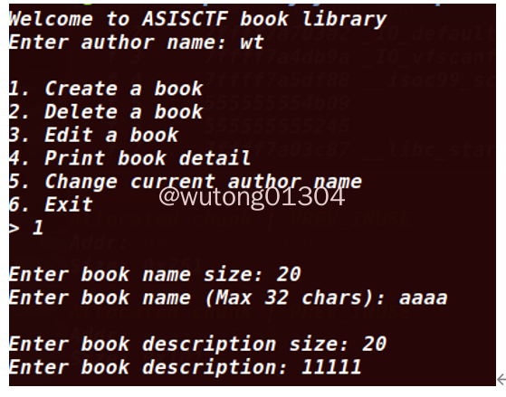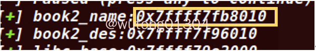 1、与思路1相同,利用打印作者名的漏洞,创建书1,打印book1 information的地址。
