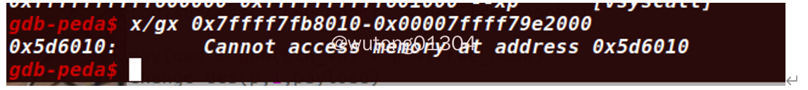 4、泄露libc地址。先通过修改书的名字,溢出一个字符“\x00”,将原先的book1 infomation覆盖掉(0x5555557583a0à0x555555758300),此时查看书的内容,就是查看我们伪造的fake book information,就可以泄露book2_name在mmap的地址。mmap开辟出的块与libc基址的偏移是固定的,因此只要拿到mmap开辟出的chunk的地址,就能通过一个“固定的偏移”得到libc。如图,通过book2_name的地址(0x7ffff7fb8010)和libc(0x7ffff79e2000)的地址,计算其偏移:0x7ffff7fb8010 - 0x00007ffff79e2000 = 0x5d6010