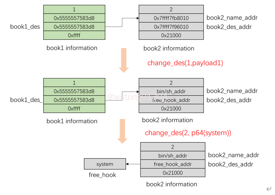 6、然后通过修改book1的内容(即将内容写入book2_name地址)。将book2 information的book2_name修改为bin/sh地址,将book2des修改为free_hook地址。然后修改book2的内容为system地址,即向free_hook地址写入system函数地址。