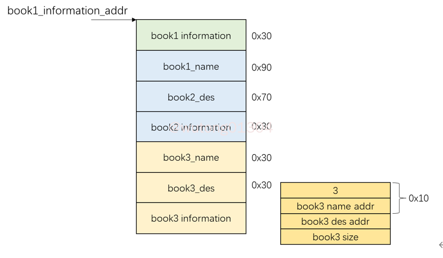 3、free书2,此时,book2_name的堆会进入unsorted bin,其fd,bk会指向unsorted bin的链表头,通过其fd指针即可泄露unsorted bin的地址。而book2_name的fd地址可以通过book1 information的地址计算出来,即boo2_name_fd=book1_information+0x30。如上图所示。