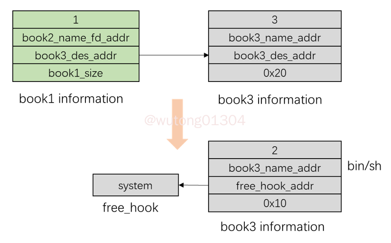 6、获取地址以后,剩下的思路就跟思路1的一样啦。获取free_hook的地址和system的地址,通过修改book1的内容,向boo3_des_addr处写入free_hook的内容,在修改boo3的内容,向free_hook中写入system。