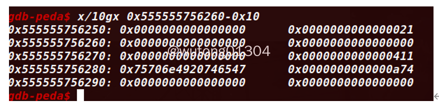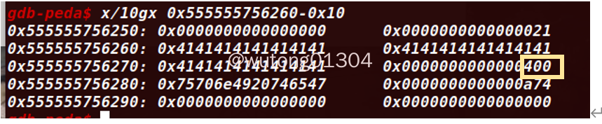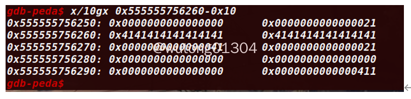 p ptr 看一下 ptr 指向的是哪一个地址。x/10gx 0x555555756260-0x10 然后查看一下那一块的内存,减去 0x10 是因为 chunk 前面要记录一些信息,比如前 0x8 如果前一个是空闲的话就记录前一个 chunk 的大小,否则就给前一个用来存数据。后面 0x8 记录的分别是该 chunk 的大小和 A、M、P 标志位。
