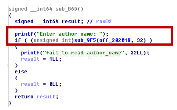 分析其反汇编代码,首先输入作者名字,在首次输入时,会将数据写入off_202018位置,输入最大为32。