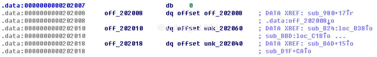 v3可以视为book information存放处,其存放地址(off_202018)和最初我们存放作者名字的地址相连。如下: